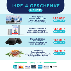 Bei Ihrer Bestellung der Schlafhilfe "Nao" heute erhalten Sie diese vier Geschenke im Gesamtwert von über 80 CHF kostenlos dazu.